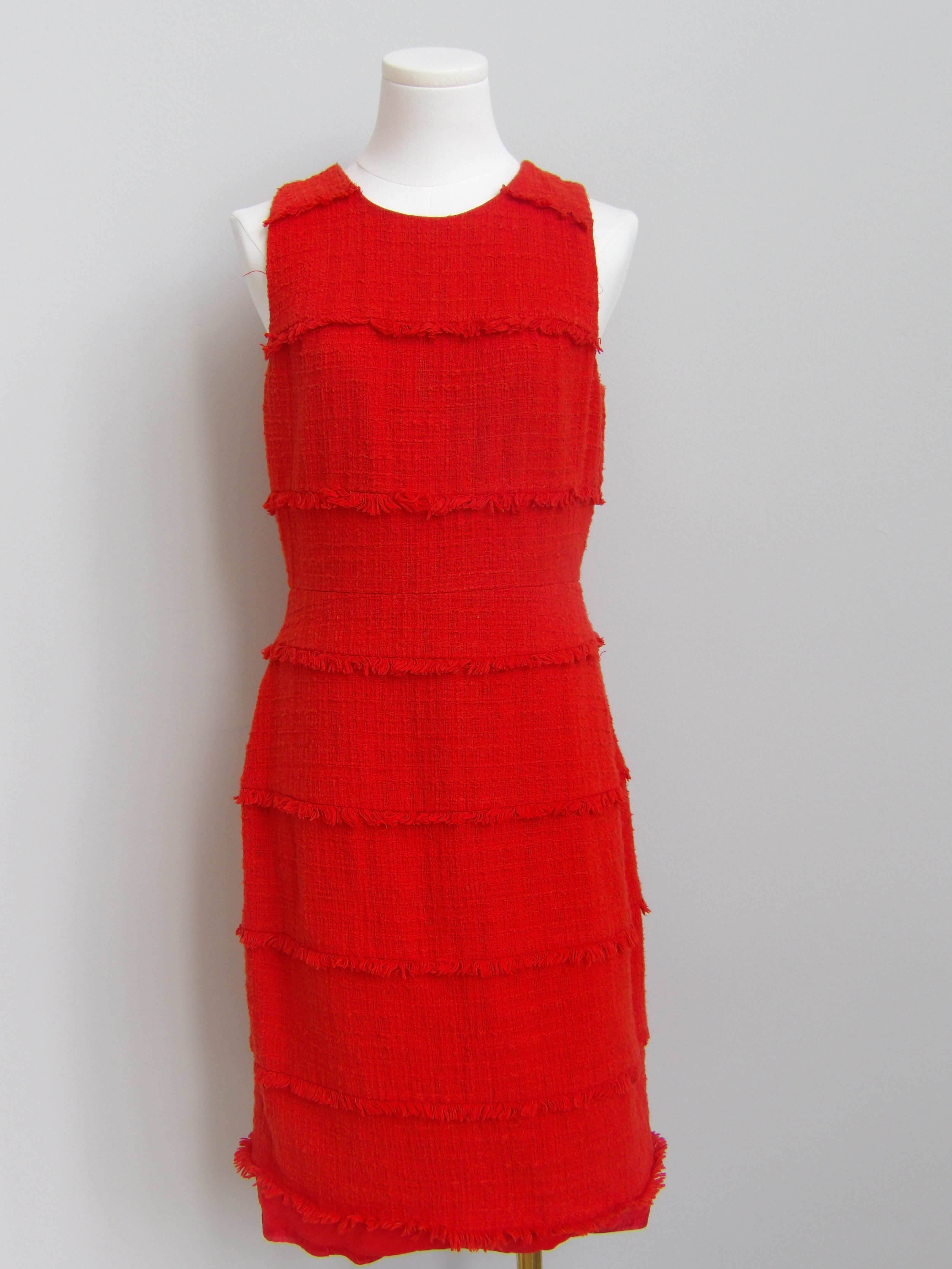 Classic meets contemporary in this vibrant coral sheath dress from J.Crew. Crafted in a subtly textured fabric, this sleeveless dress features a flattering tailored silhouette with button-tab accents at the waist for a refined touch. Perfect for the office, brunch, or any occasion that calls for polished style with a pop of color. Size 4.
